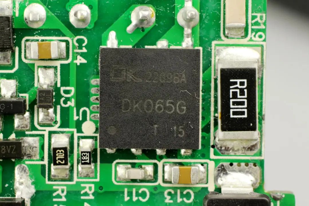 充電器初級主控芯片采用了一顆來自東科的合封氮化鎵芯片DK065G,是一顆內(nèi)部集成了650V氮化鎵開關管的準諧振反激開關電源功率芯片。DK065G采用谷底開通以降低開關損耗,最高支持250kHz開關頻率,待機功耗低于50mW,采用DFN8*8封裝,適用于PD快充,電源適配器等應用。