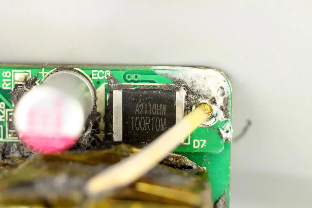 充電器內(nèi)部PCBA模塊采用黃銅散熱片包裹,PCB正面打膠,背面有導熱墊,將熱量傳導至散熱片散發(fā),滿足長時間大功率輸出設計。初級濾波電容來自黃寶石,次級固態(tài)濾波電容來自柏瑞凱,整機用料均為知名品牌。