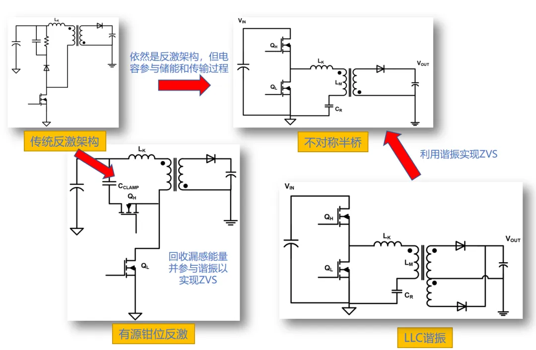 不對稱半橋AHB拓撲技術集成了LLC和反激的優(yōu)點,實現(xiàn)了初級側零電壓開關(ZVS)和次級側零電流開關(ZCS),提高了系統(tǒng)的效率。通過采用電感與電容雙儲能元件,可以有效減小變壓器體積,從而提高系統(tǒng)的整體緊湊性。